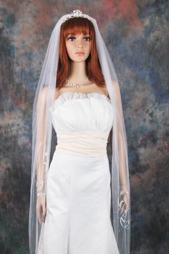 Three flower motifs of sequins, faux pearls, and silver lined bugle beads are embroidered along the edge of the veil. The embroidery is completely hand crafted.The veil is attached to a silver wire comb. Wire combs are more pliable and versatile, it can be contoured to your head shape and can be pinned if necessary (as opposed to plastic, which is thicker, inflexible and more cumbersome). Due to variations in the many different browsers and monitors on the internet and how colors appear, the pictures of our veils are not an exact representation of the actual color. Please order our Swatches at http://www.amazon.com/gp/product/B005OZMAJ0 so you can be confident you are getting the colors you intended to get.